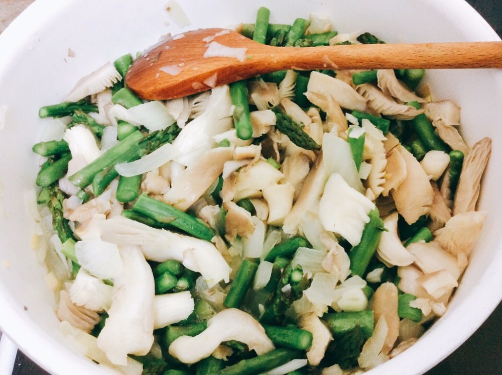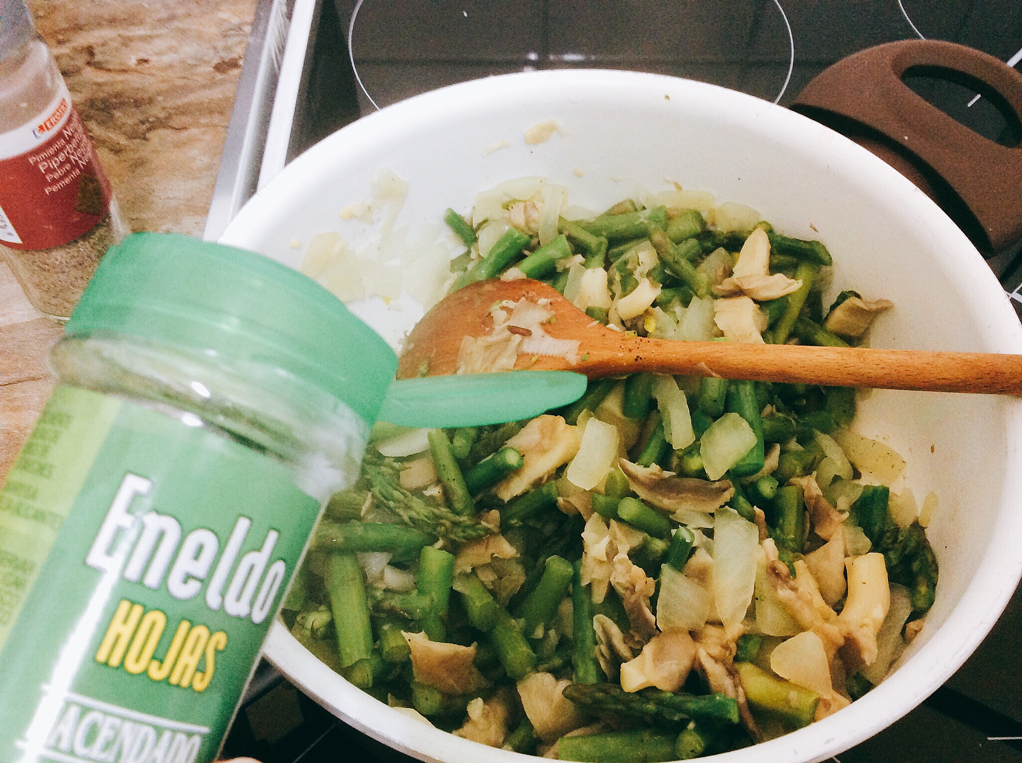 A continuación, añadimos las setas, otra pizca de sal, el eneldo y la pimienta negra y cocinamos todo hasta que las tres verduras estén cocinadas.