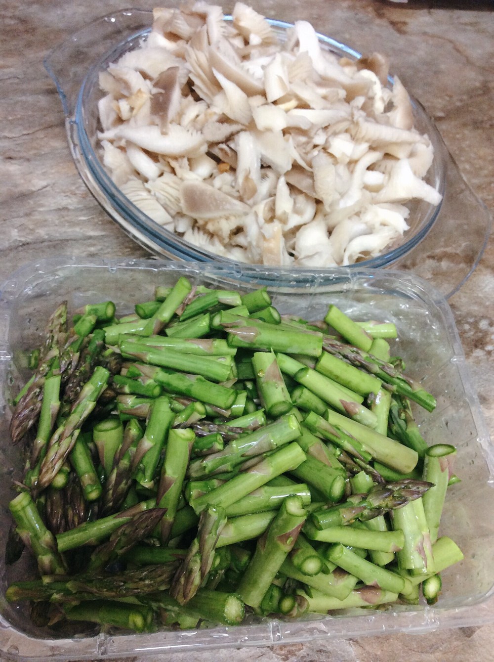 Mientras tanto, vamos a lavar y cortar los trigueros, las setas y la cebolla y lo reservamos.