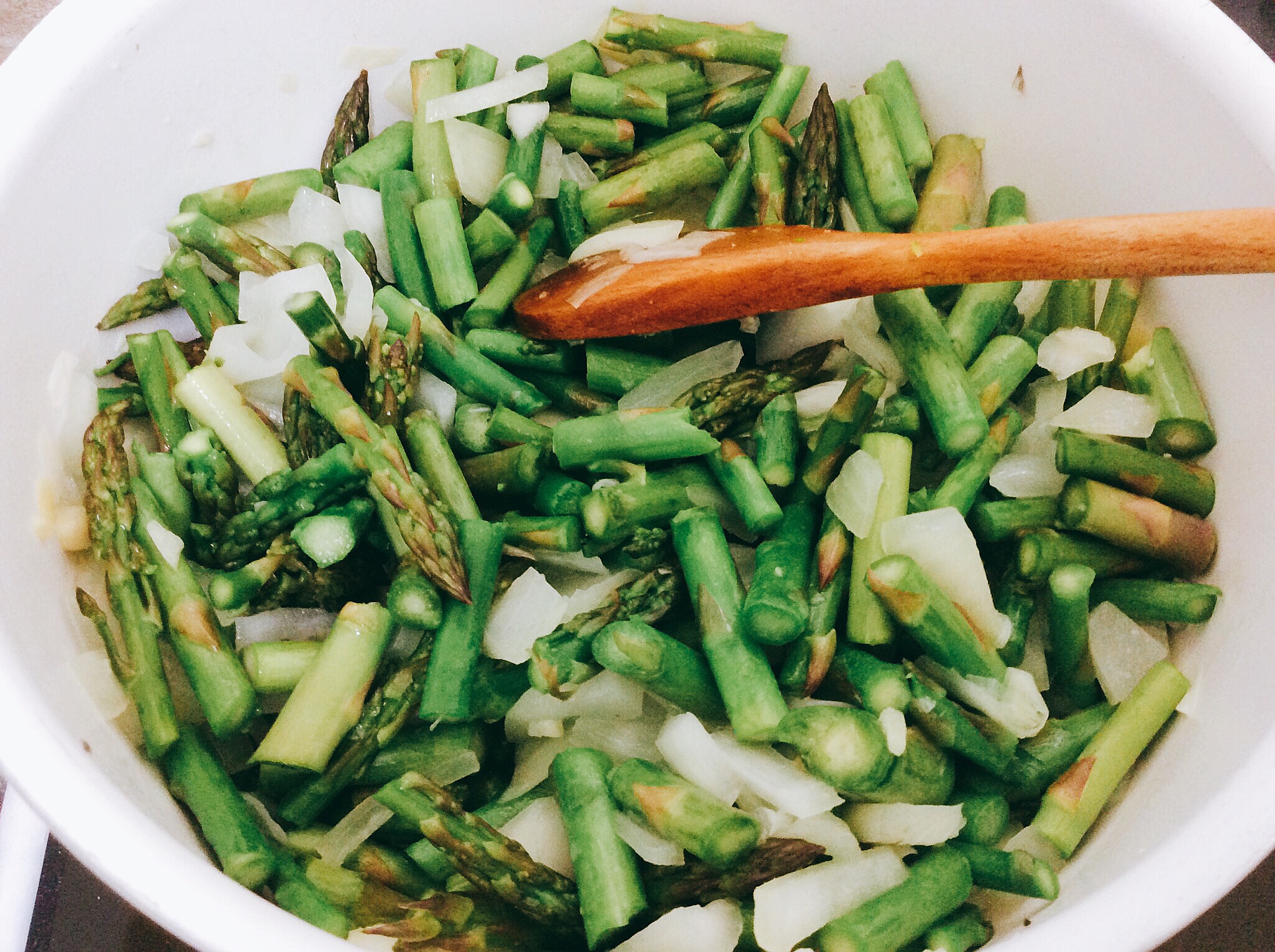 En este momento, añadimos los espárragos, otra pizca de sal y cocinamos durante otro par de minutos.
