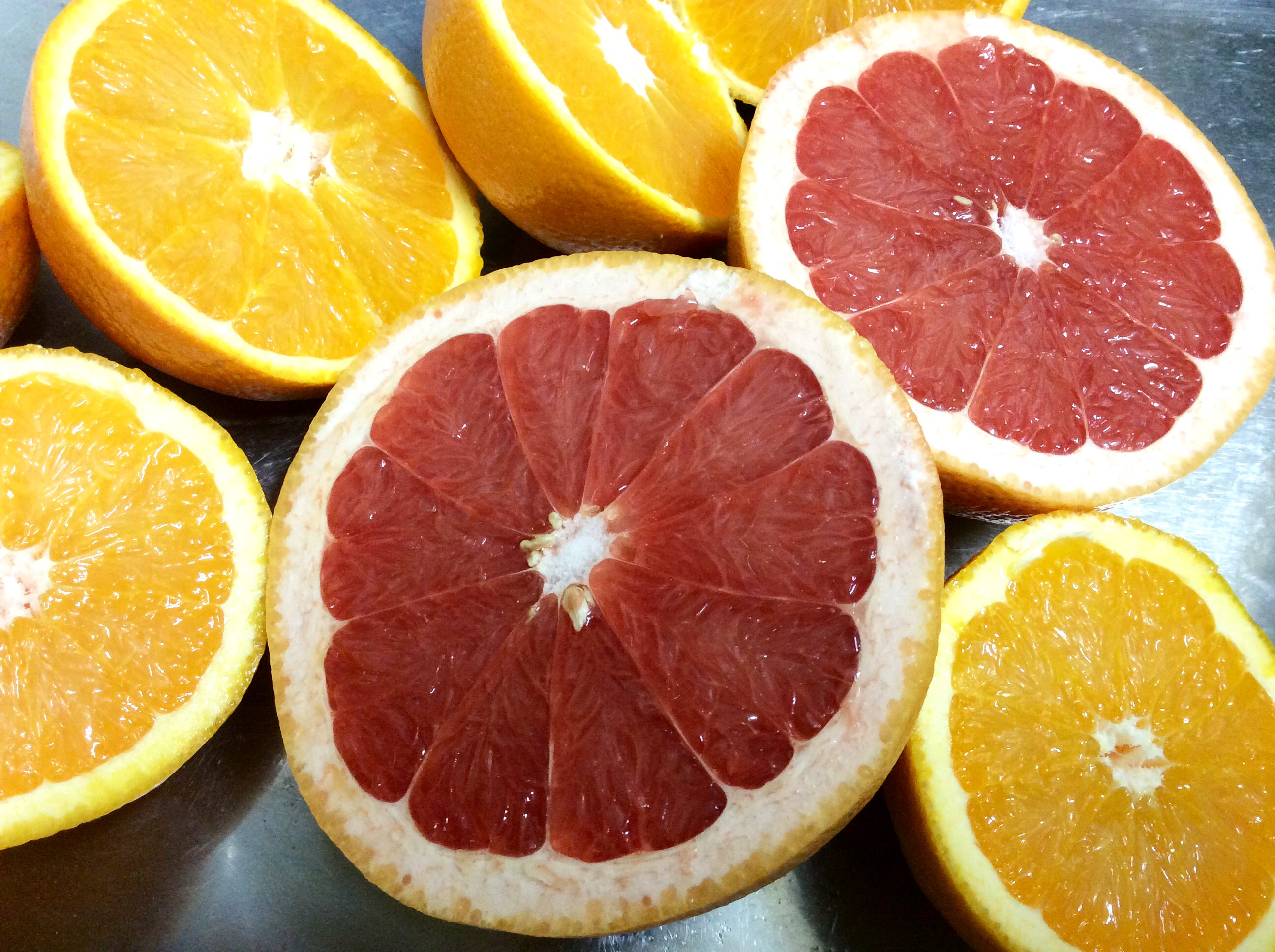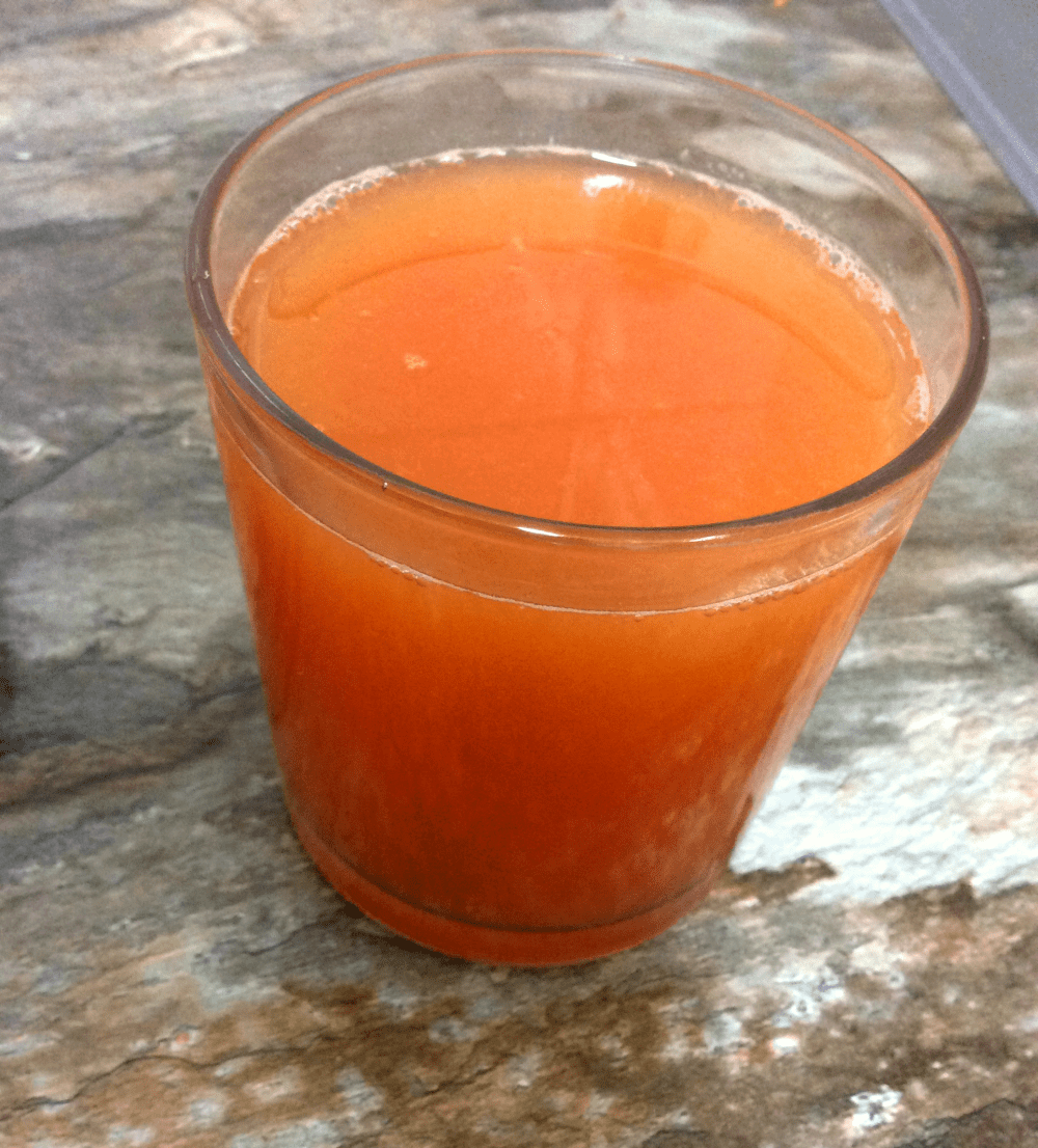Exprimir las tres frutas y repartir en dos vasitos. Si no os gusta el toque amargo del pomelo, podéis echarle una cucharadita de stevia/azúcar, o utilizar más naranja que pomelo.