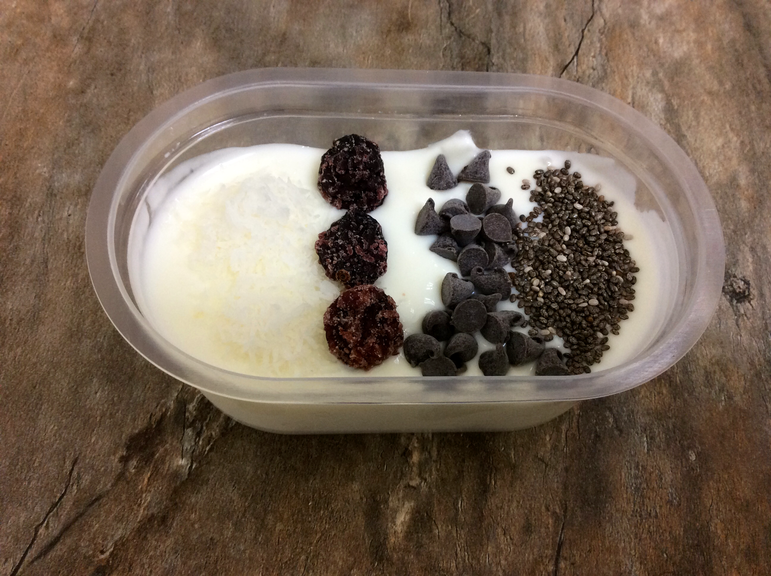 Yogur natural cremoso con semillas de chia, coco, arándanos y chips de chocolate