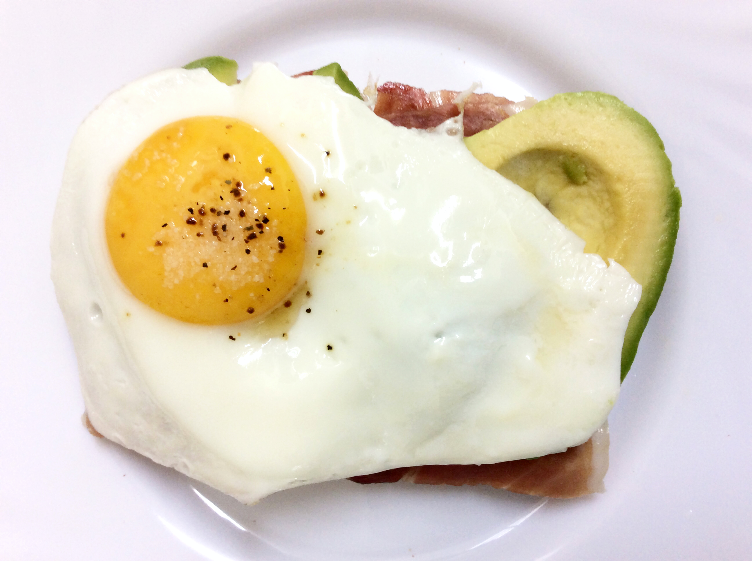 Tosta de pan de cereales con aguacate, huevo a la plancha y jamón ibérico: