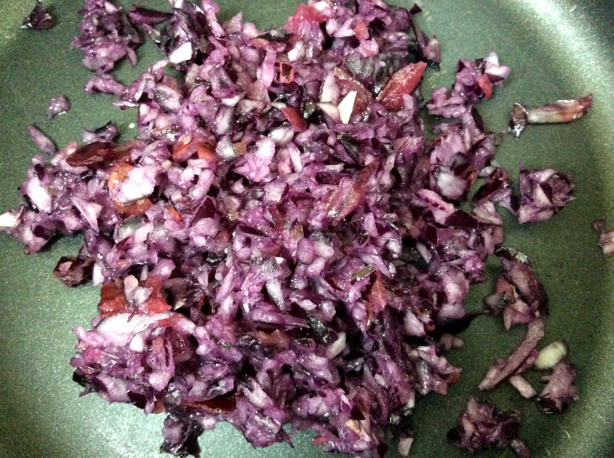 Ponemos a calentar un chorrito de aceite en una cazuela pequeña a fuego medio. Añadimos el jengibre y la cebolla y rehogamos hasta que esté más blandita (aproximadamente 4 minutos).