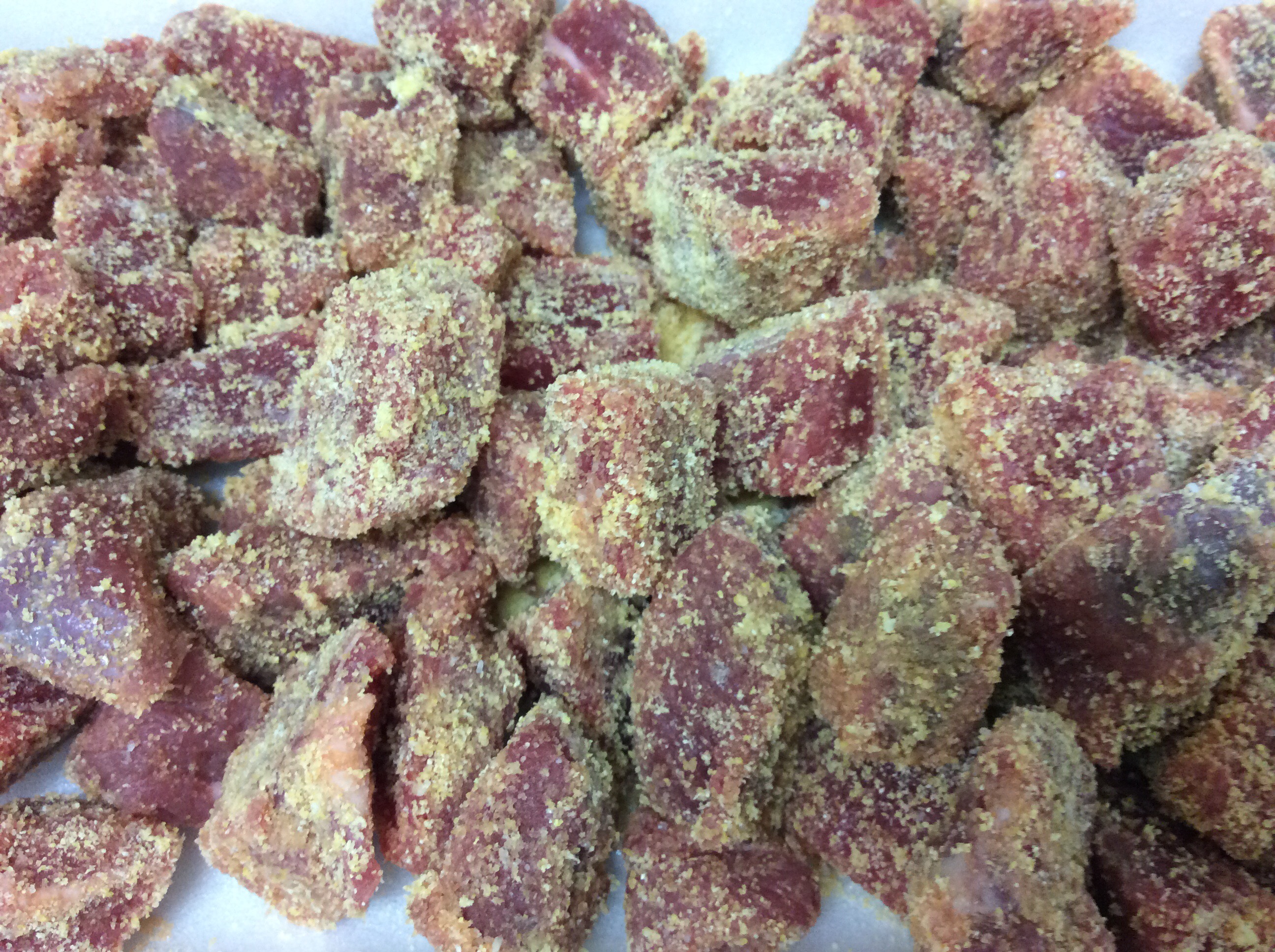 Cortamos la carne en cuadraditos y la rebozamos con la harina de maíz.