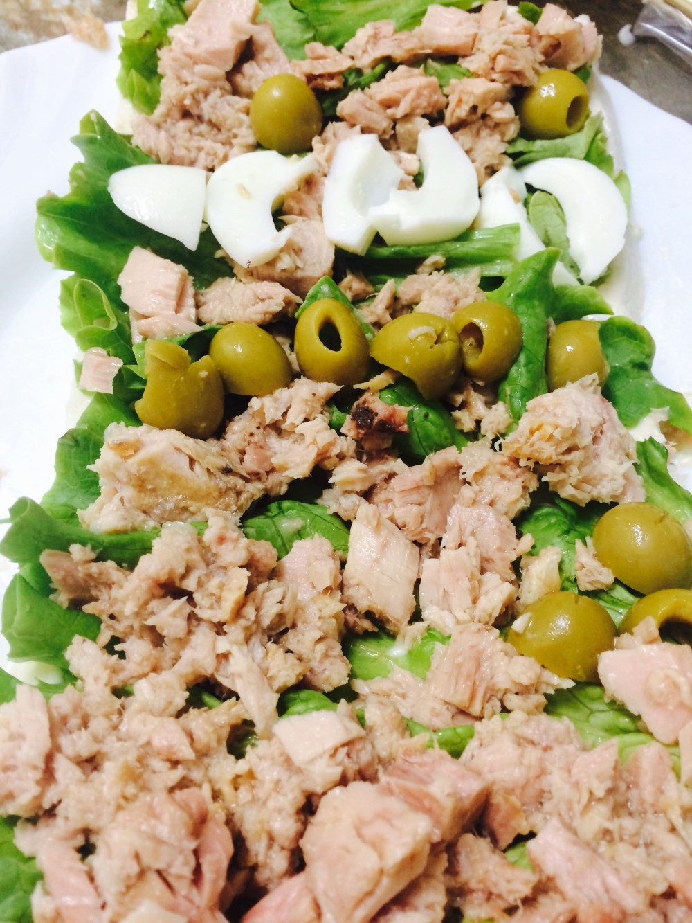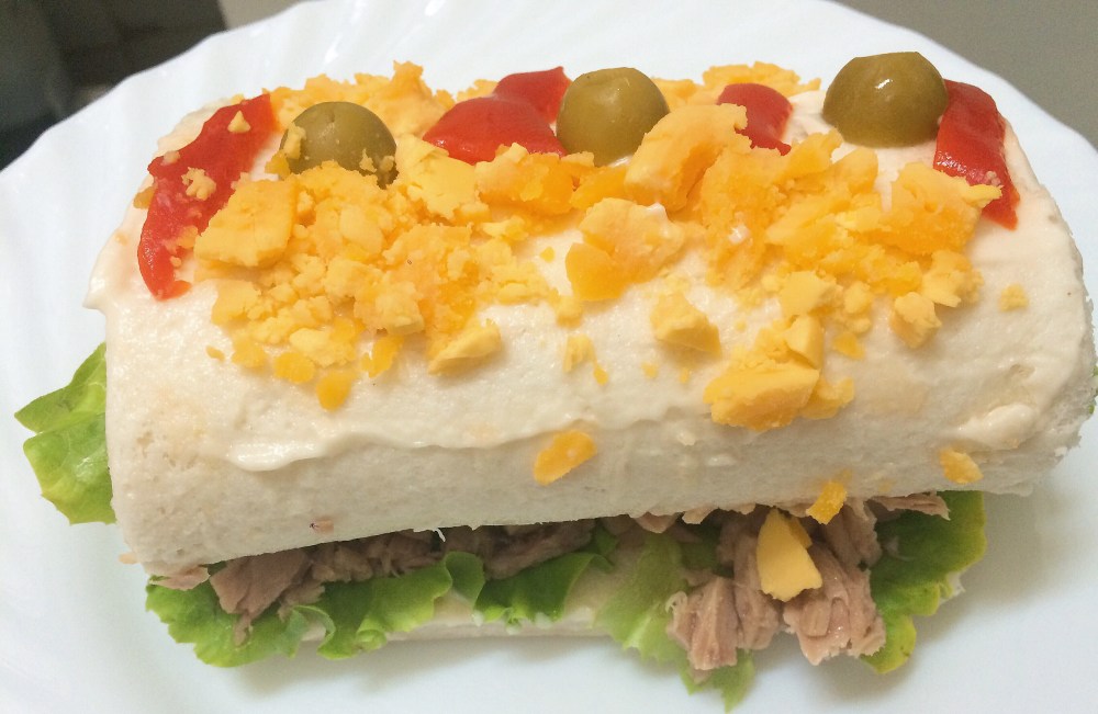 Ponemos la mayonesa como base y rellenamos con todos los ingredientes en el orden que queramos.