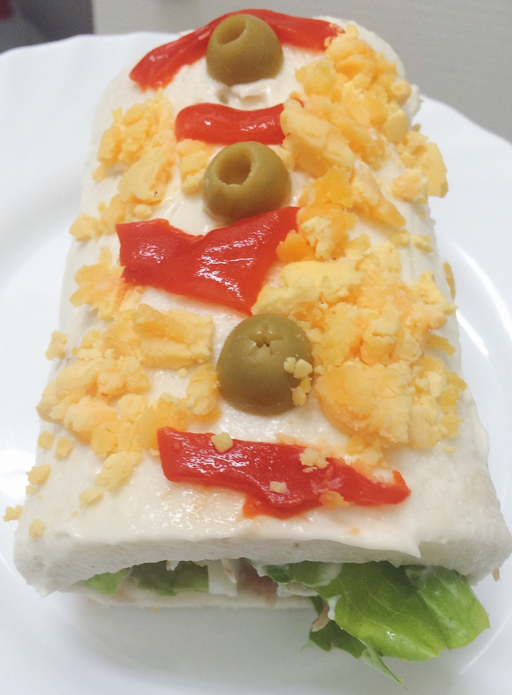 Cubrimos de mayonesa y decoramos con las aceitunas, los pimientos y desmigando la yema de huevo.
