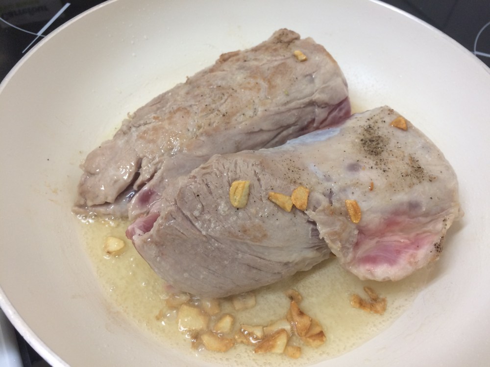 Ponemos a calentar a fuego fuerte el aceite en una olla grande y añadimos los ajos picados. Cuando estén dorados, añadimos los solomillos y los sellamos por ambos lados.