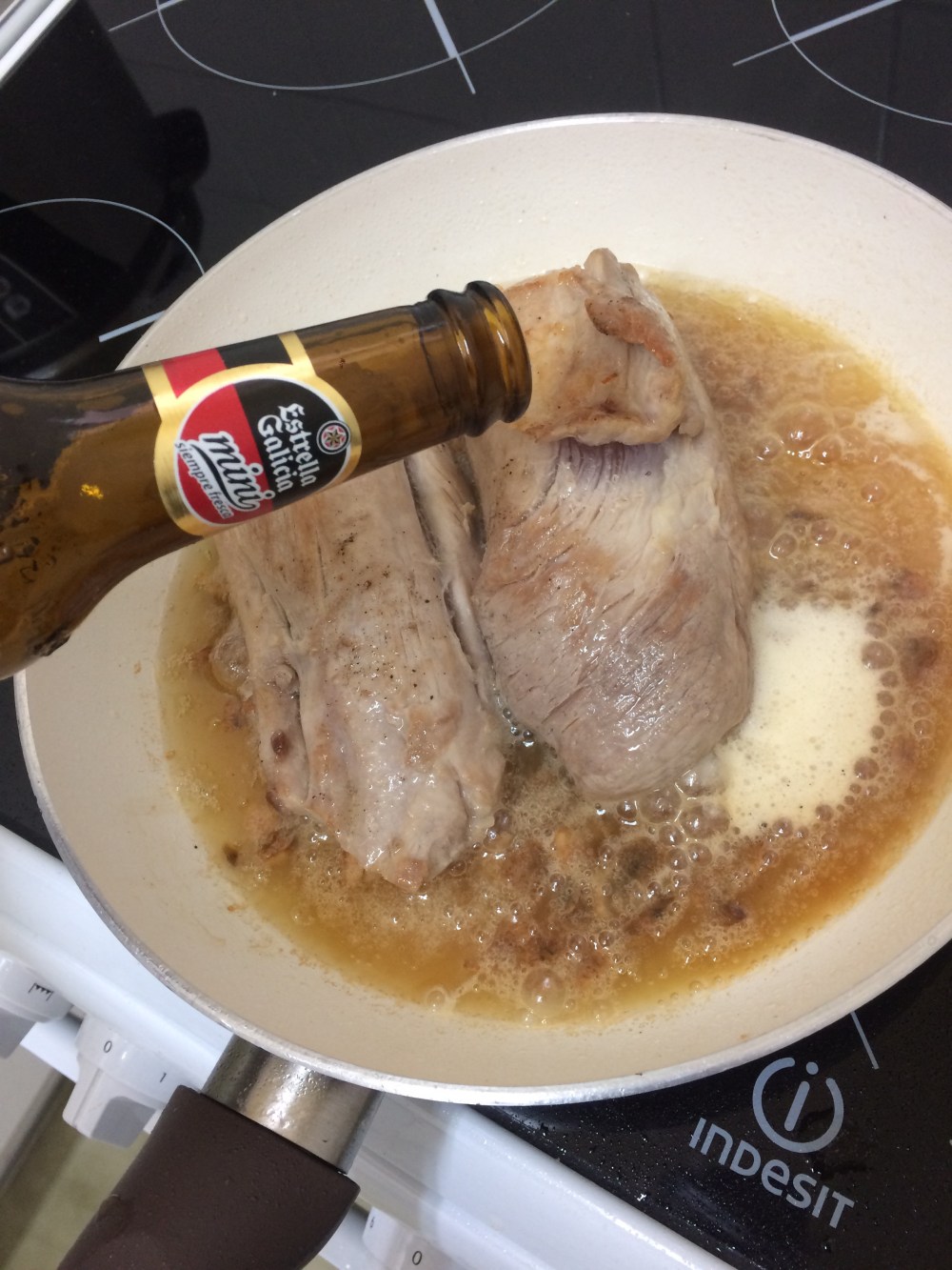 Cuando los hayamos sellado, añadimos la cerveza y el vino y los cocinamos dándoles la vuelta de vez en cuando hasta que la cerveza se haya evaporado en la mitad.