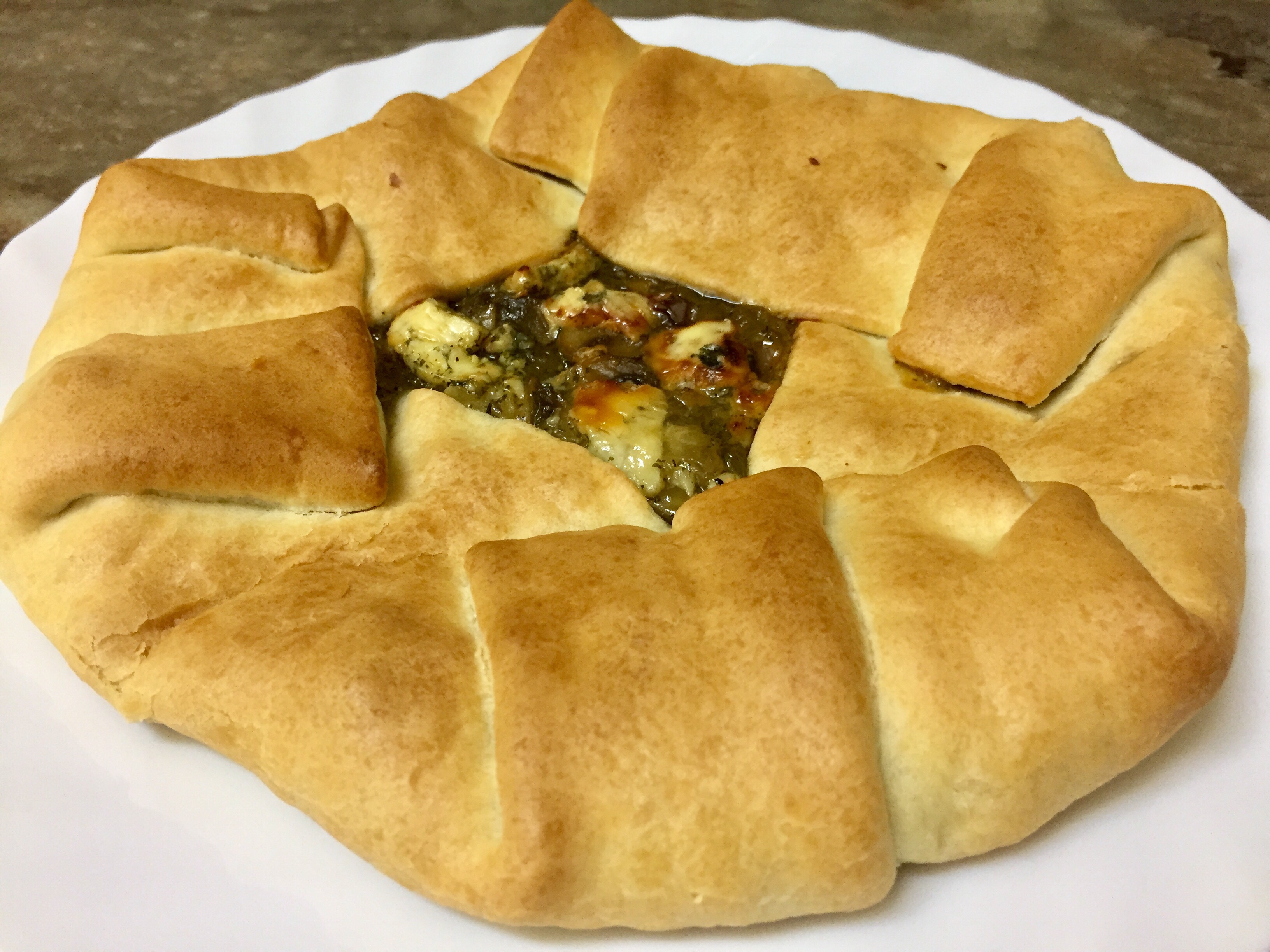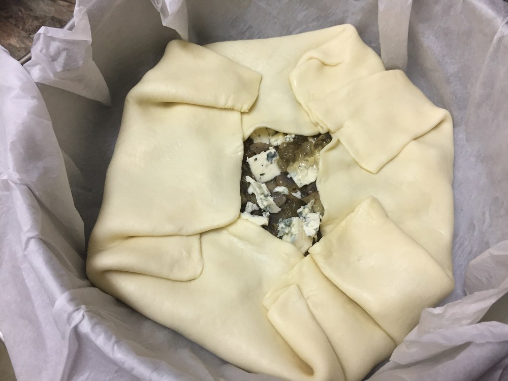 Añadimos unas miguitas de queso azul al gusto y tapamos con la masa sobrante dejando un huequito en el medio.