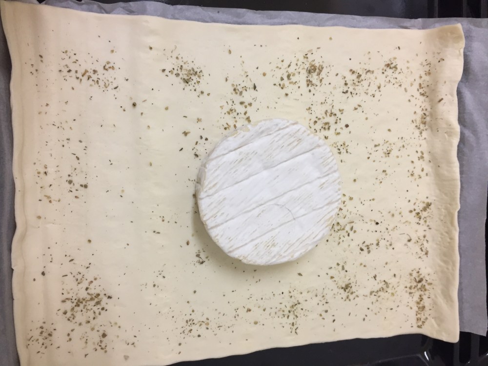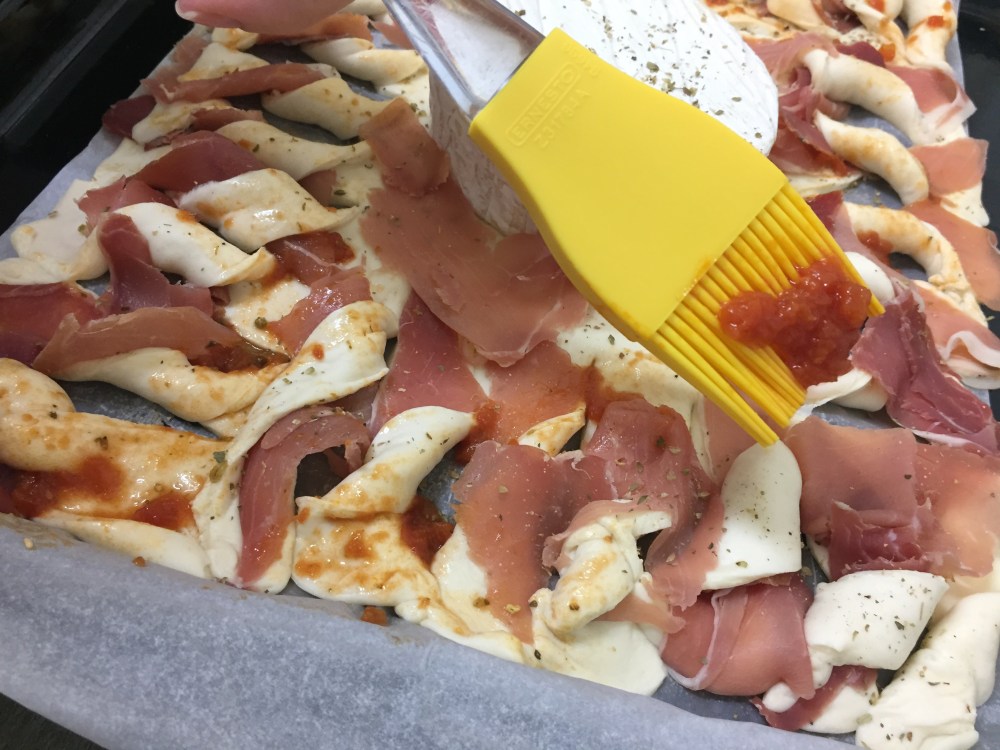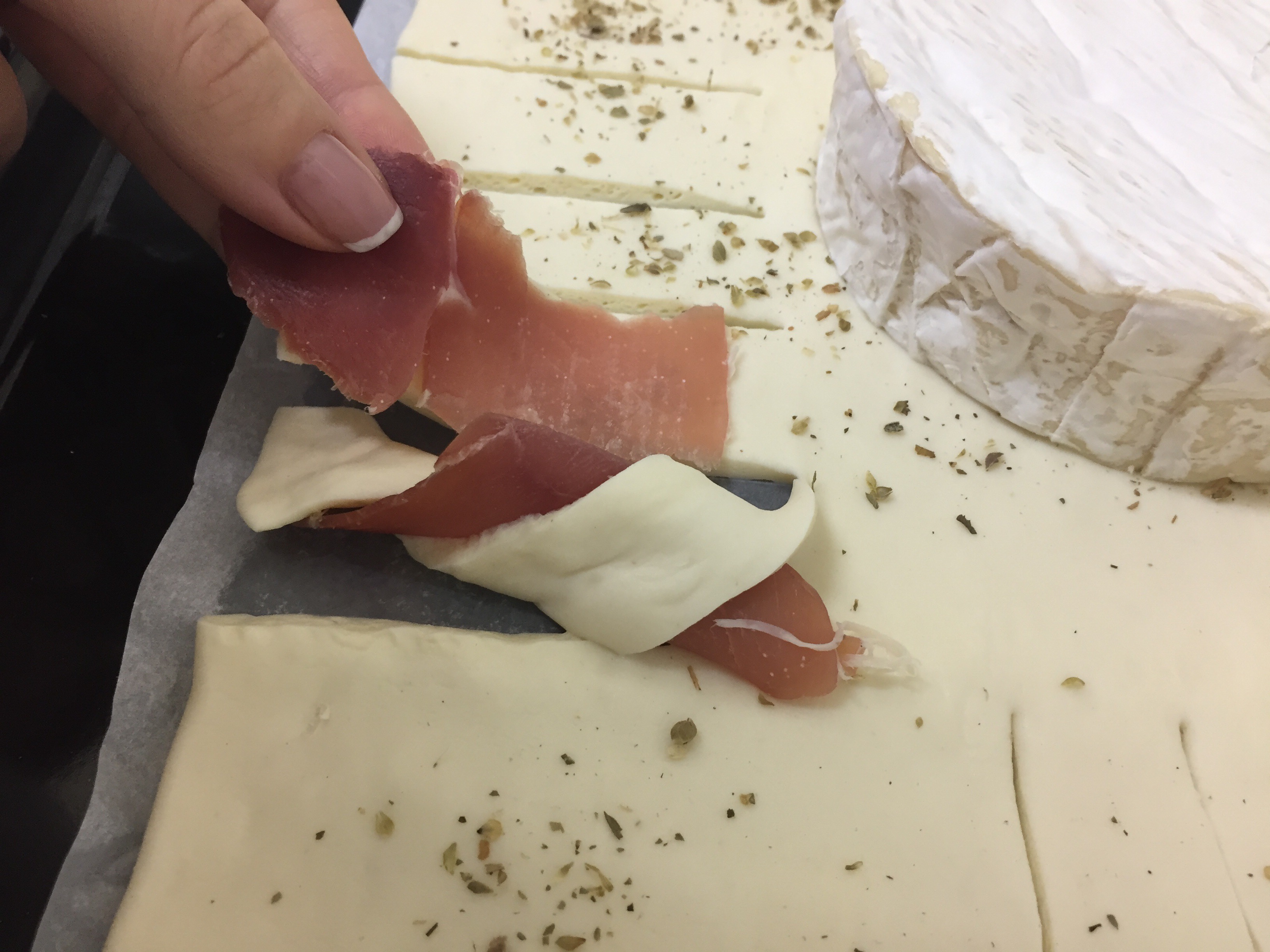 Ponemos el queso en el centro de la masa y presionamos para hacer un huequito. Espolvoreamos la masa con orégano, cortamos la masa en tiras y enrrollamos cada tira con una loncha de jamón dándole dos o tres vueltas.