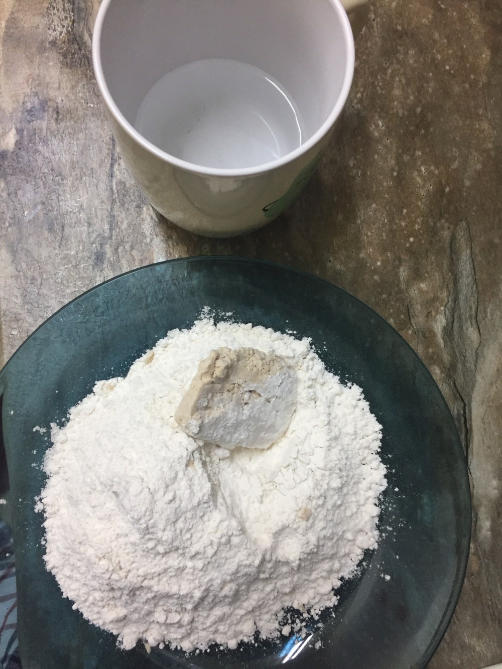 Mezclamos la harina, el agua y la levadura hasta tener una masa homogénea y dejamos levar durante 1 hora en un sitio templado.