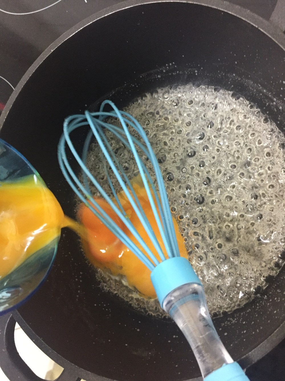 En un cazo, llevamos a ebullición el agua con el azúcar. Una vez que haya hervido un par de minutos y la mezcla sea más espesa, añadimos las yemas y continuamos removiendo hasta que tengamos una crema homogénea (similar a la crema pastelera). Retiramos, tapamos y reservamos en la nevera hasta su uso.