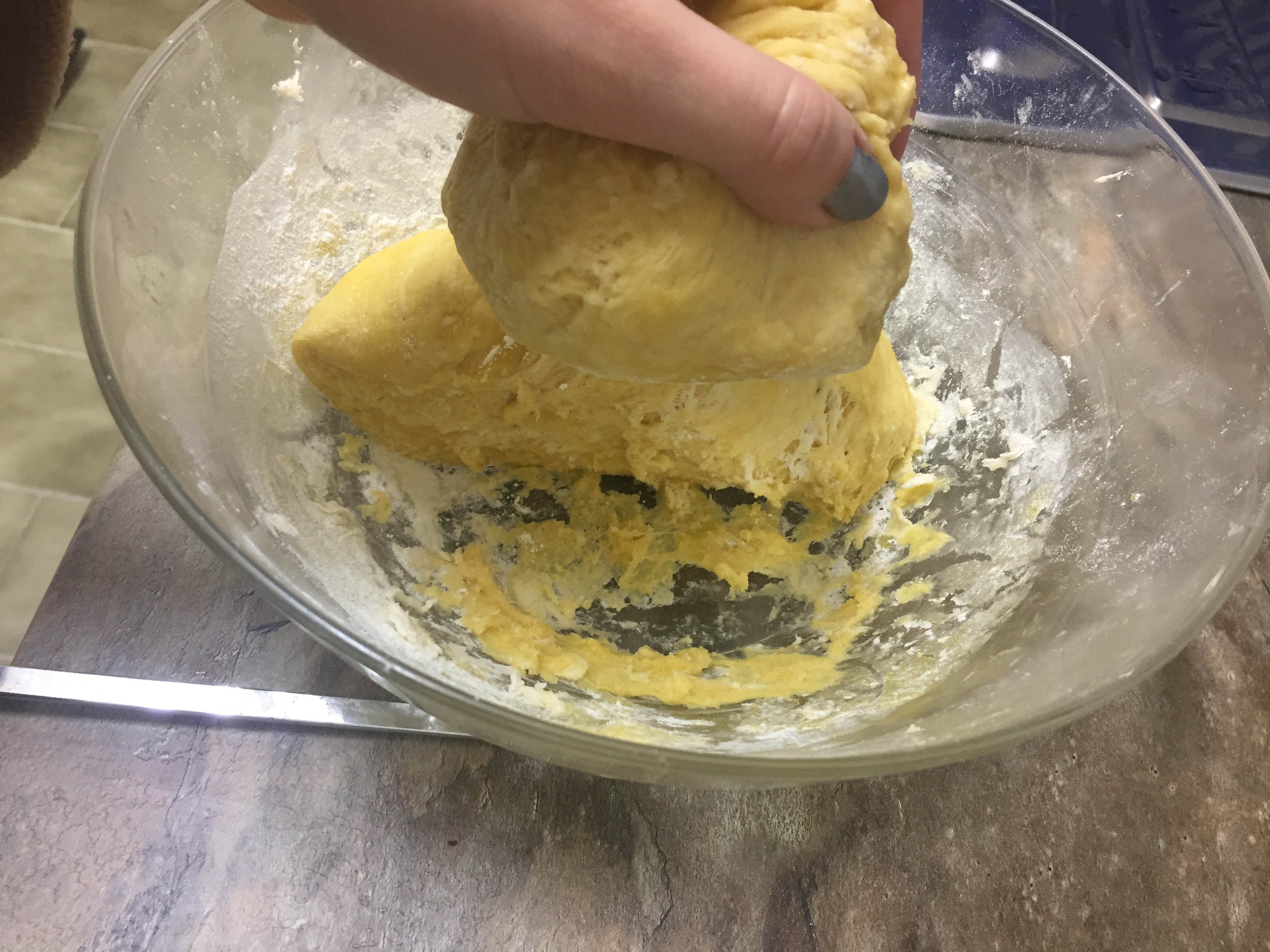 En un cuenco grande, incorporamos la harina junto con la levadura. Mezclamos seguido mientras vamos incorporando los huevos, la sal, el agua de azahar, la harina, el azúcar, el fermento y por último la mantequilla.