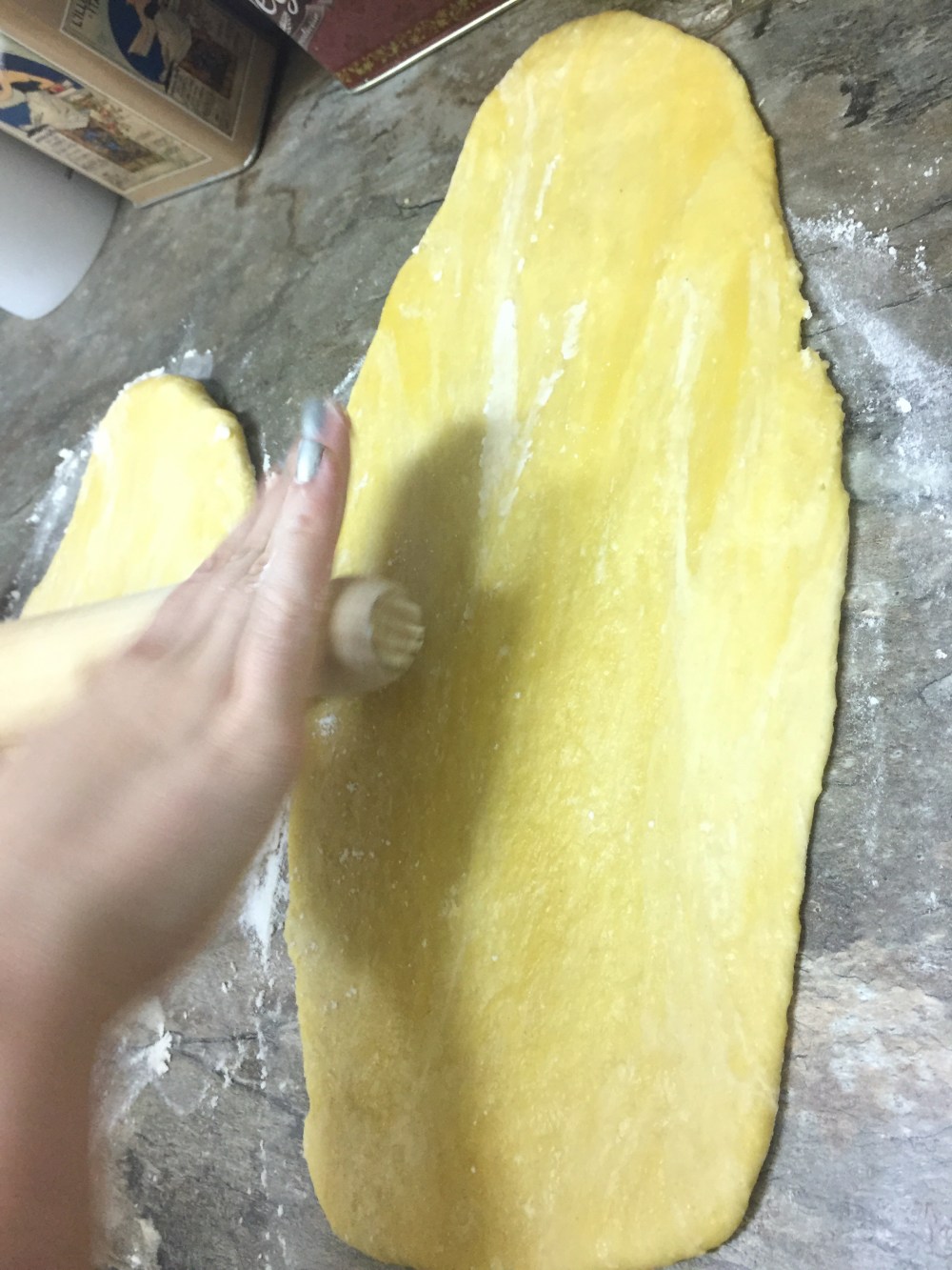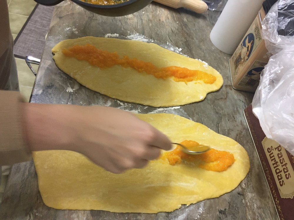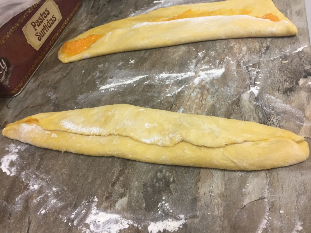 Rellenamos cada parte con una tira de la crema de yema y cerramos.