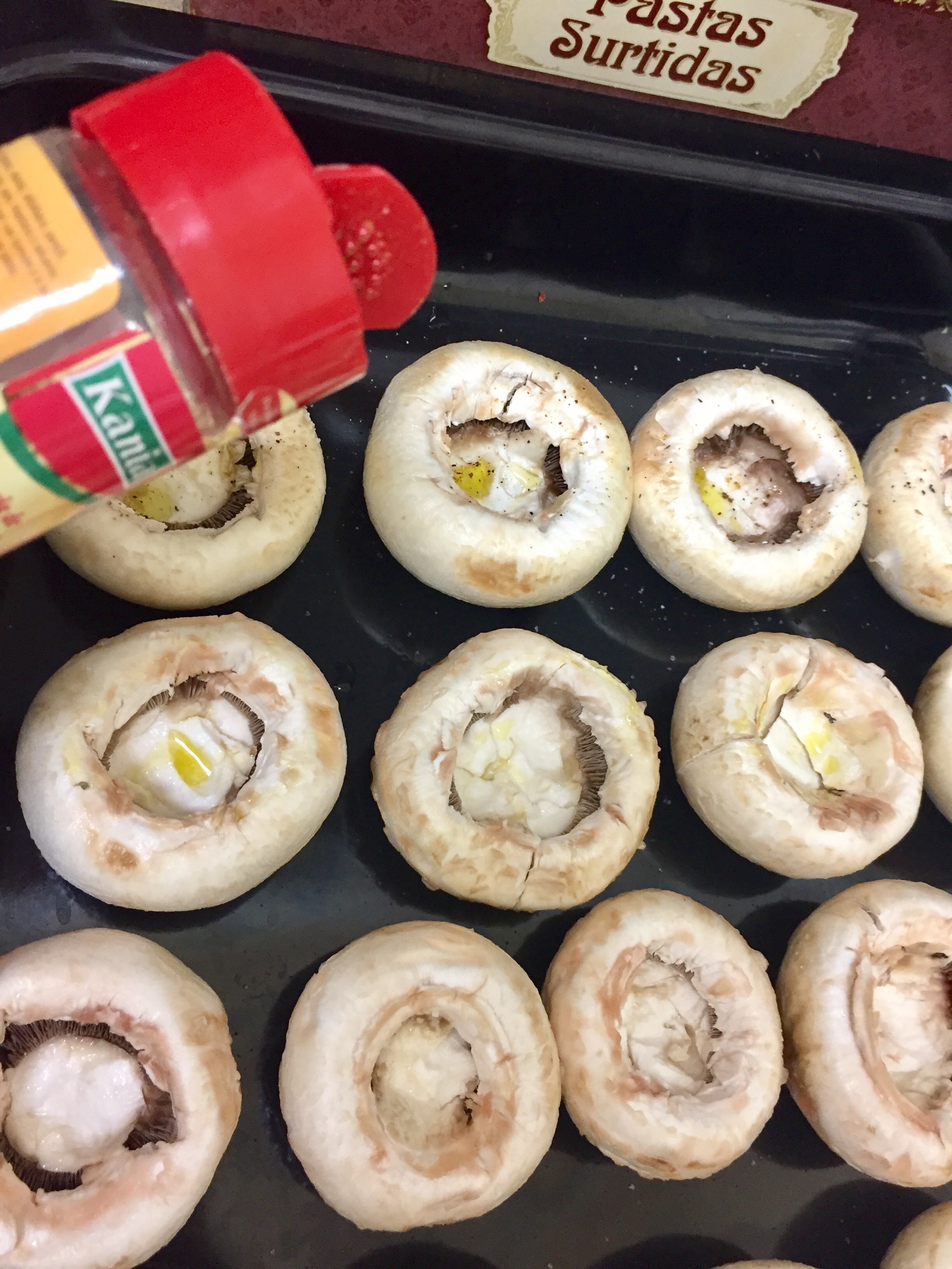 Ponemos los champiñones en una bandeja, echamos en cada uno unas gotitas de aceite de oliva, sal y especies al gusto.