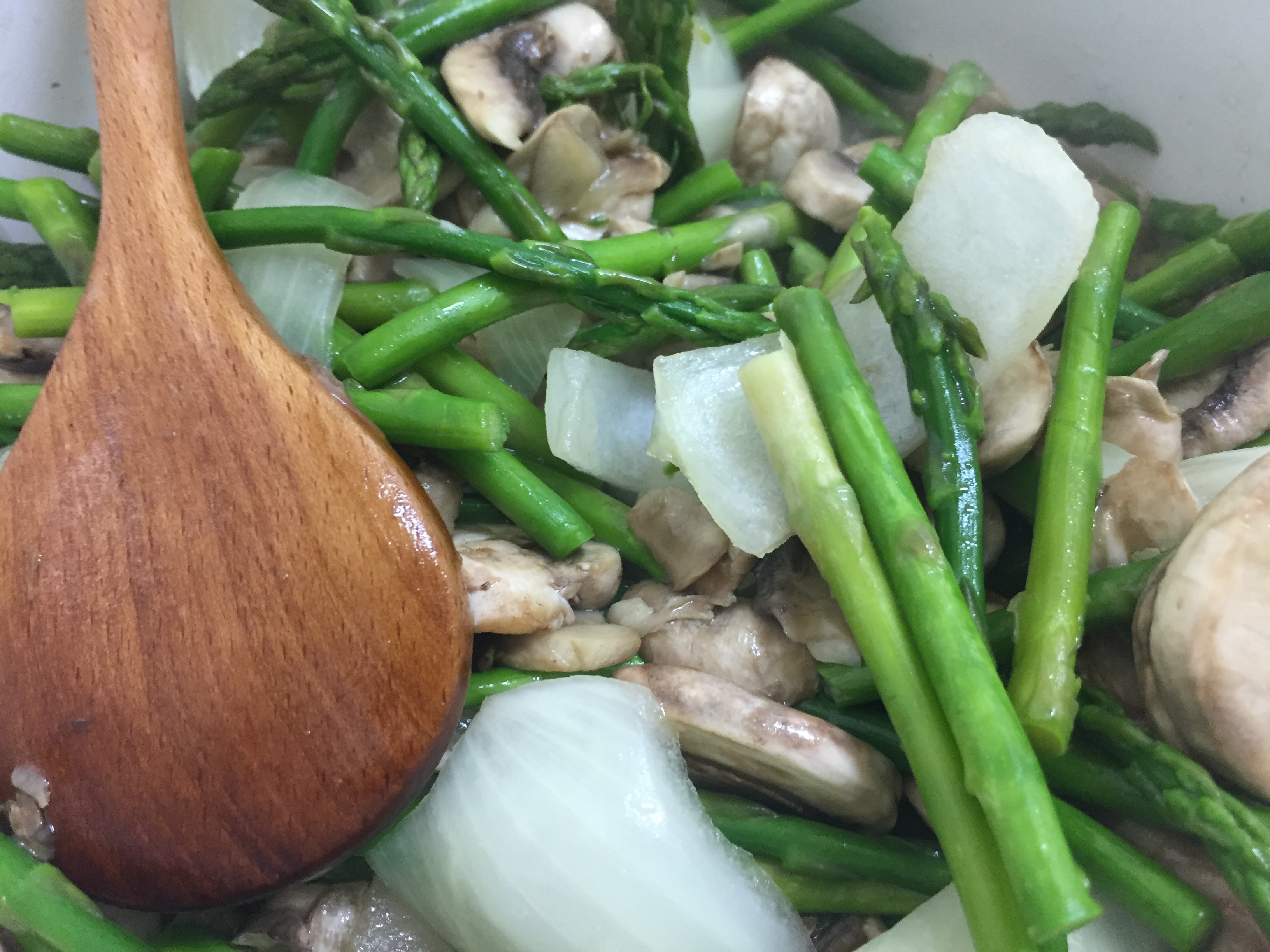 Reservamos un par de puntitas de espárragos y unos champiñones para decorar a la hora de servir.