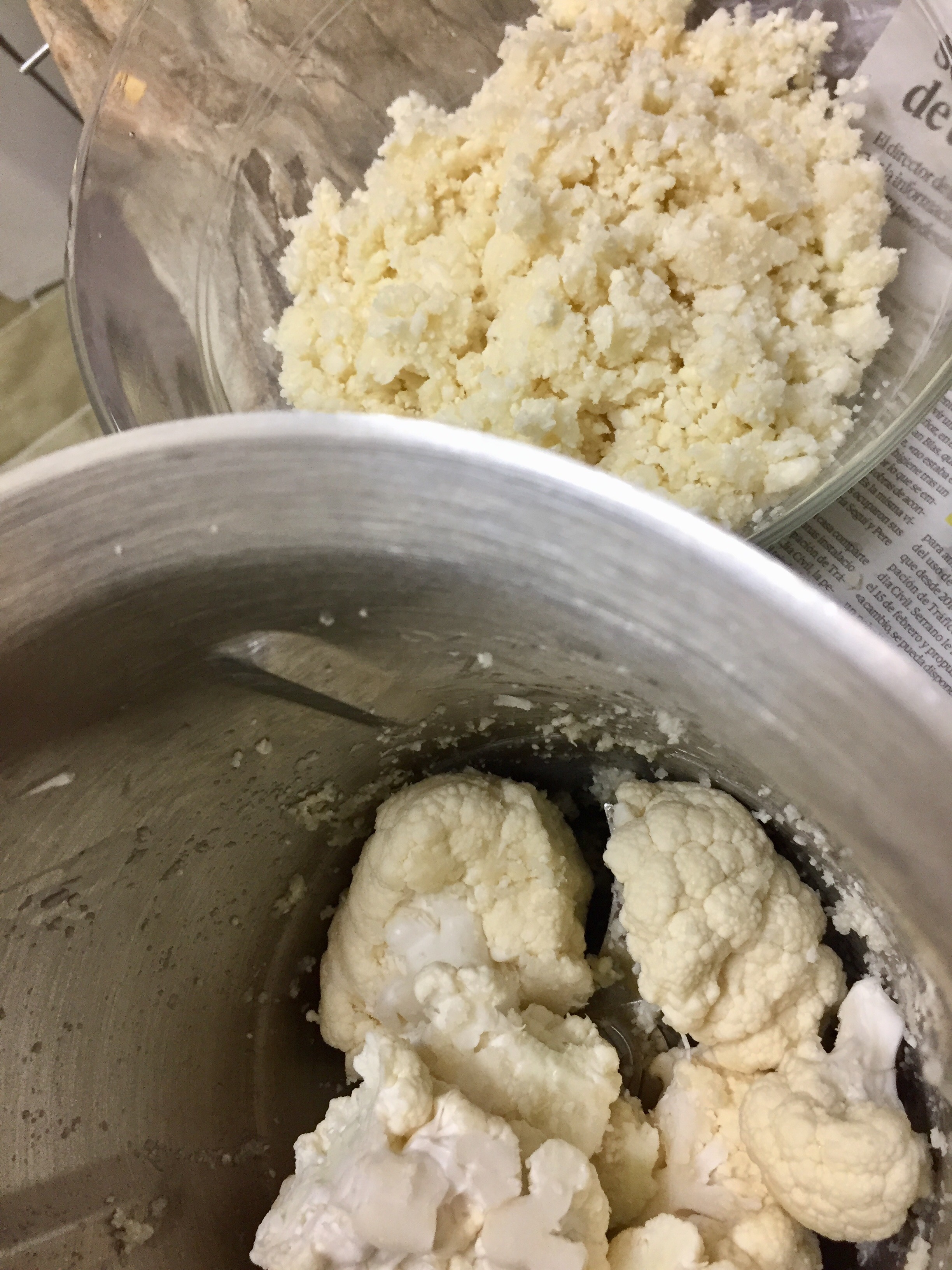 Con la ayuda de una picadora, trituramos la coliflor poco a poco hasta que tenga textura tipo arroz (que quede en miguitas).