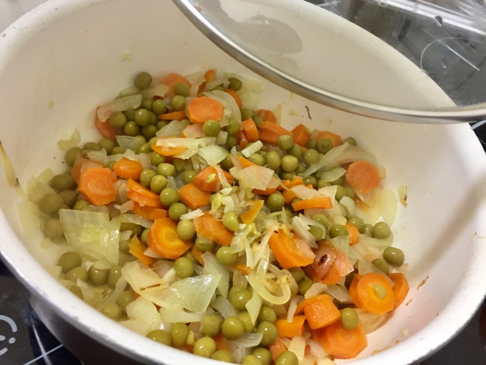 Calentamos un poco de aceite en una sartén grande a fuego medio. Añadimos el ajo, cebolla picada, los guisantes y las zanahorias picadas, salamos y salteamos unos 10 minutos hasta que esté todo tierno.