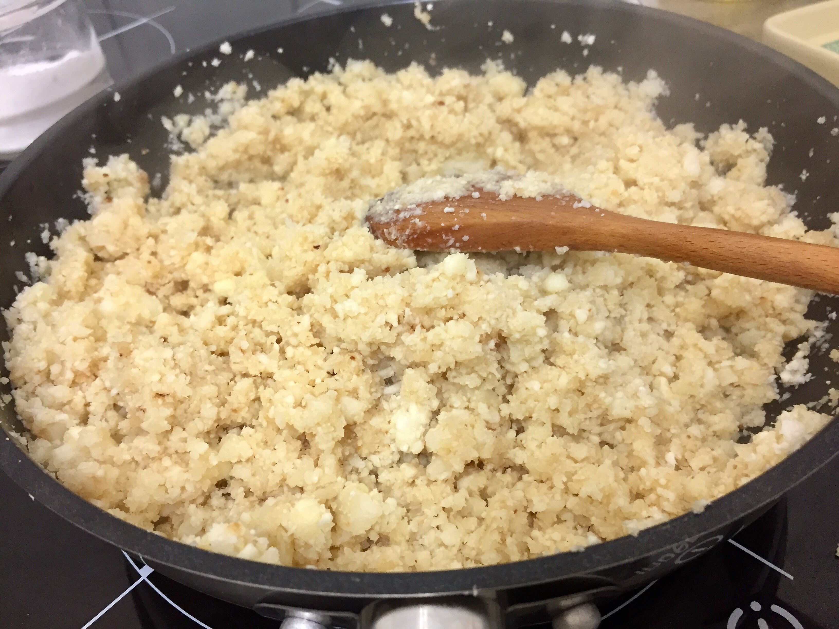 En la misma sartén, echamos un chorrito de aceite, y cuando esté caliente incorporamos el «arroz» de coliflor, salamos y salteamos removiendo constantemente durante aproximadamente 5-10 minutos hasta que esté tierna.