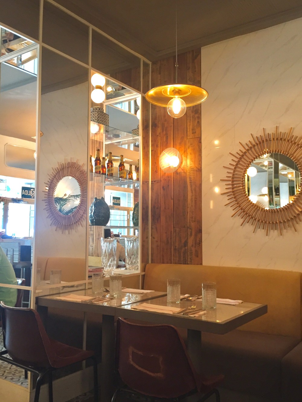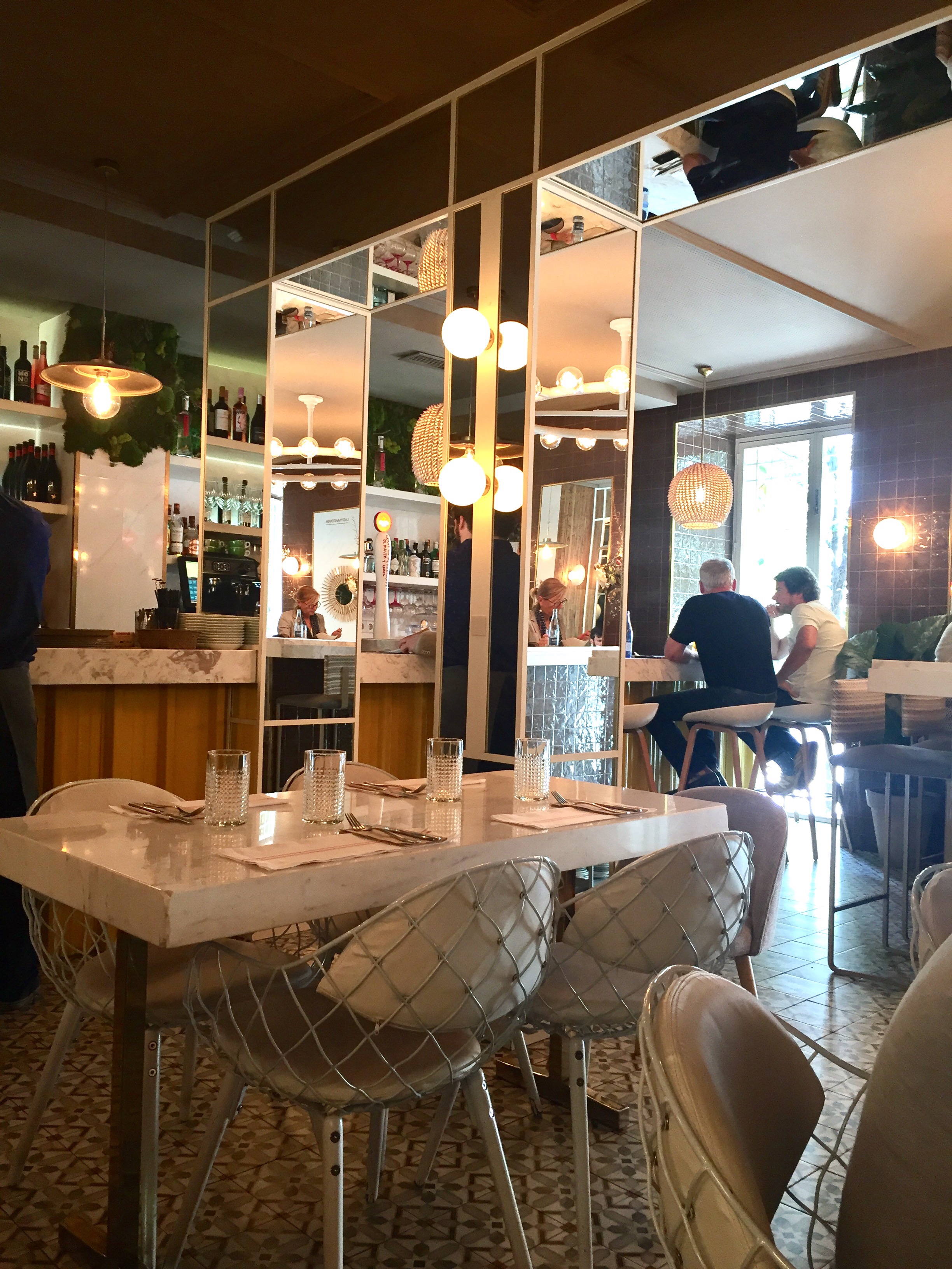 Es un restaurante súper luminoso y decorado con un estilo muy particular que llama la atención. Ahora en veranito tiene una terraza estupenda que viene genial para tomar algo fuera porque la zona es muy tranquila.
