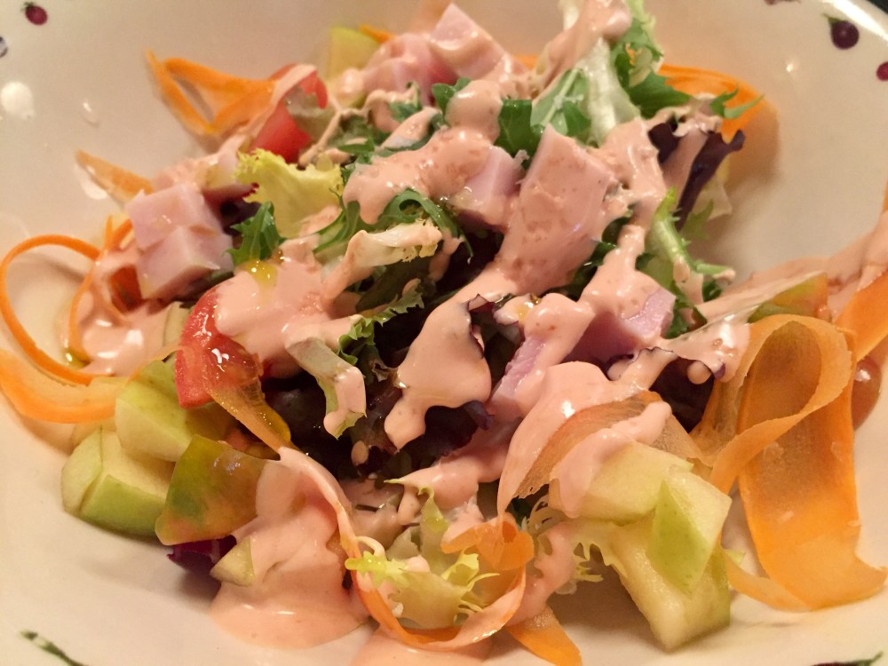 De primero elegimos una ensalada de pavo y manzana. Muy básica pero con una salsita suave que le daba muy buen sabor.