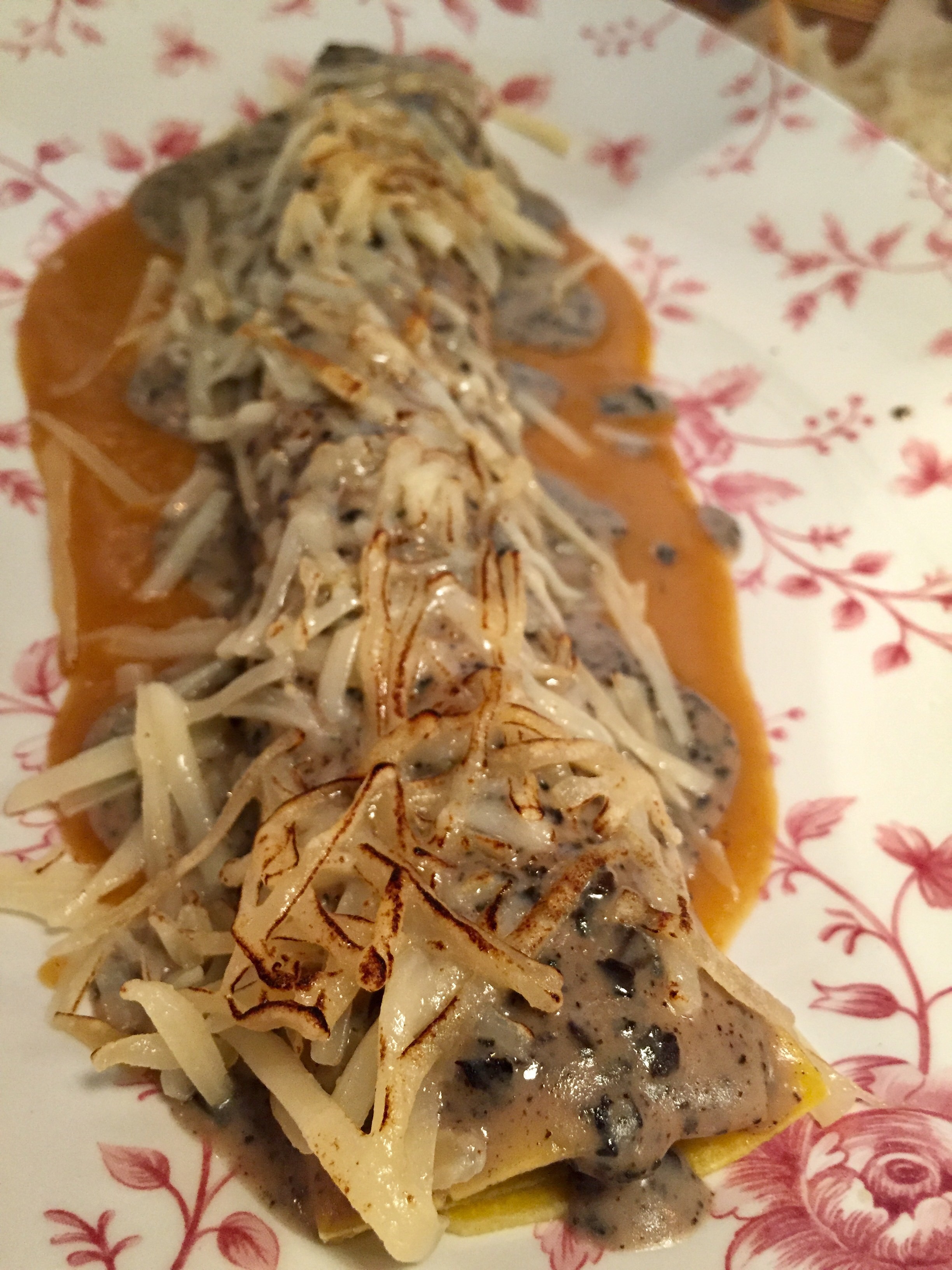 Canelón de rabo de toro deshuesado con bechamel de chantarella (de carta). Espectacular. Una combinación perfecta y unos matices de sabores muy logrados.