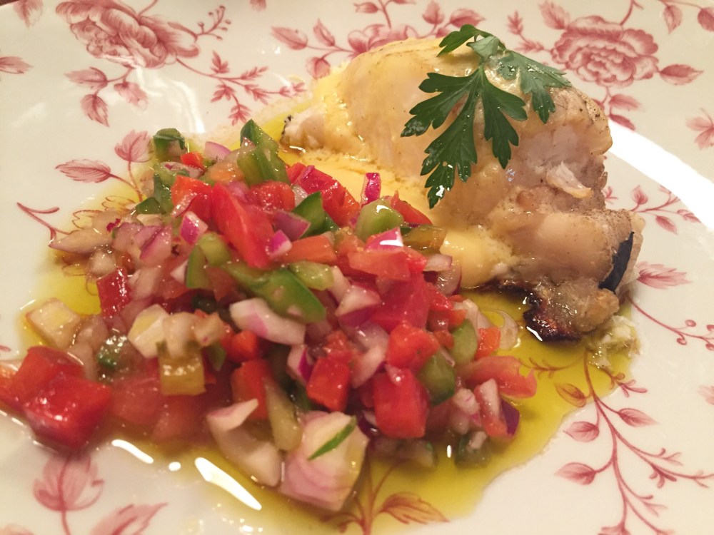 Continuamos con una Merluza en salsa holandesa con salpicón. Deliciosa. Un trozo de merluza bien grueso, jugoso y con un sabor muy rico. El toque fuerte de las verduritas combinaba fenomenal con el pescado.