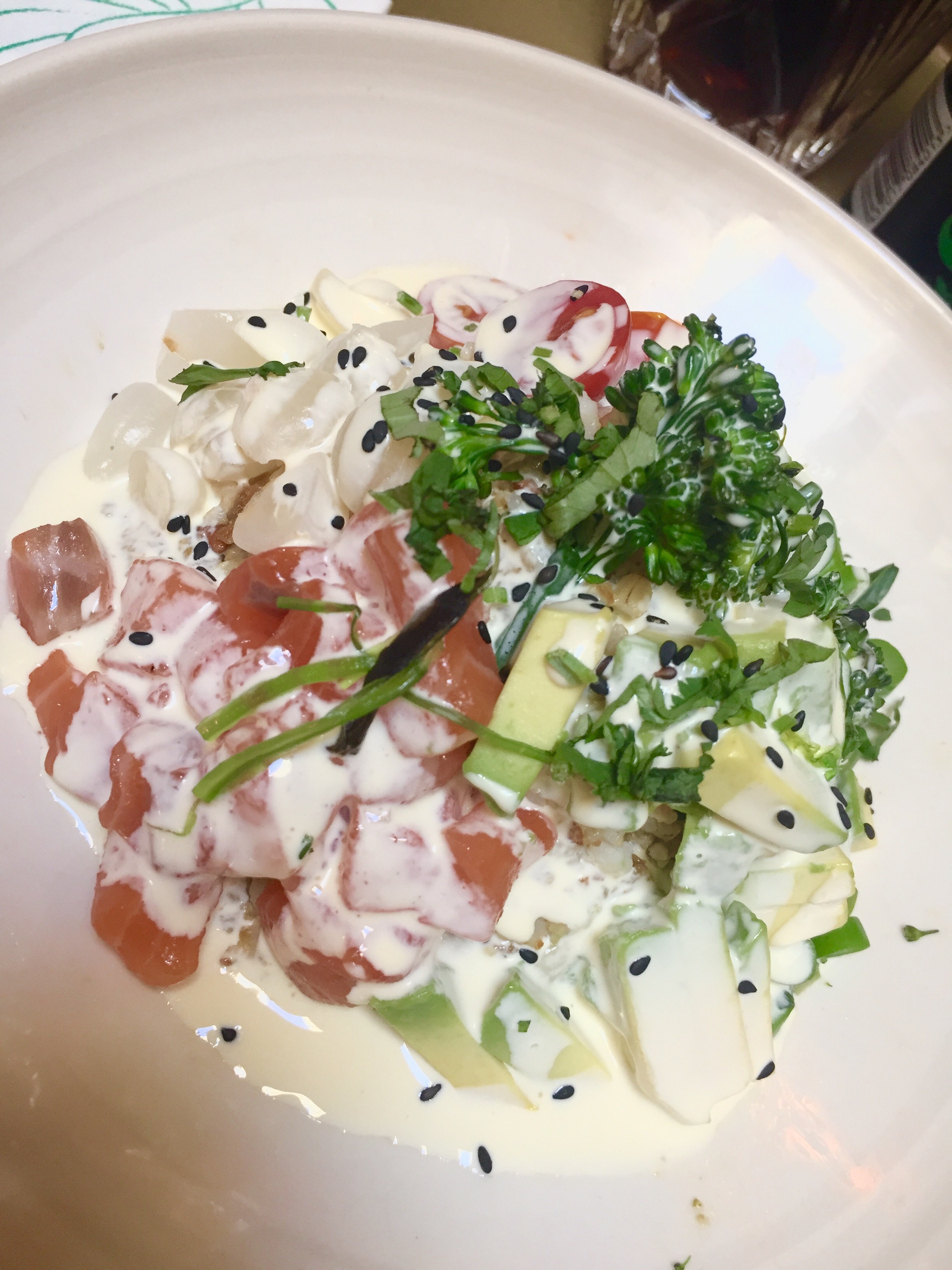 Me lo habían recomendado y me encantó. En la foto no lo parece pero es un plato hondo con una cantidad enorme. El aliño cítrico está delicioso y le da un toque perfecto al salmón, mientras que el crujiente de la cebollita le queda súper bien a la textura del arroz. Por otro lado, el aguacate y el bimi suavizan y aligeran mucho el plato. Que os voy a decir. Me encantó y repetiré seguro.