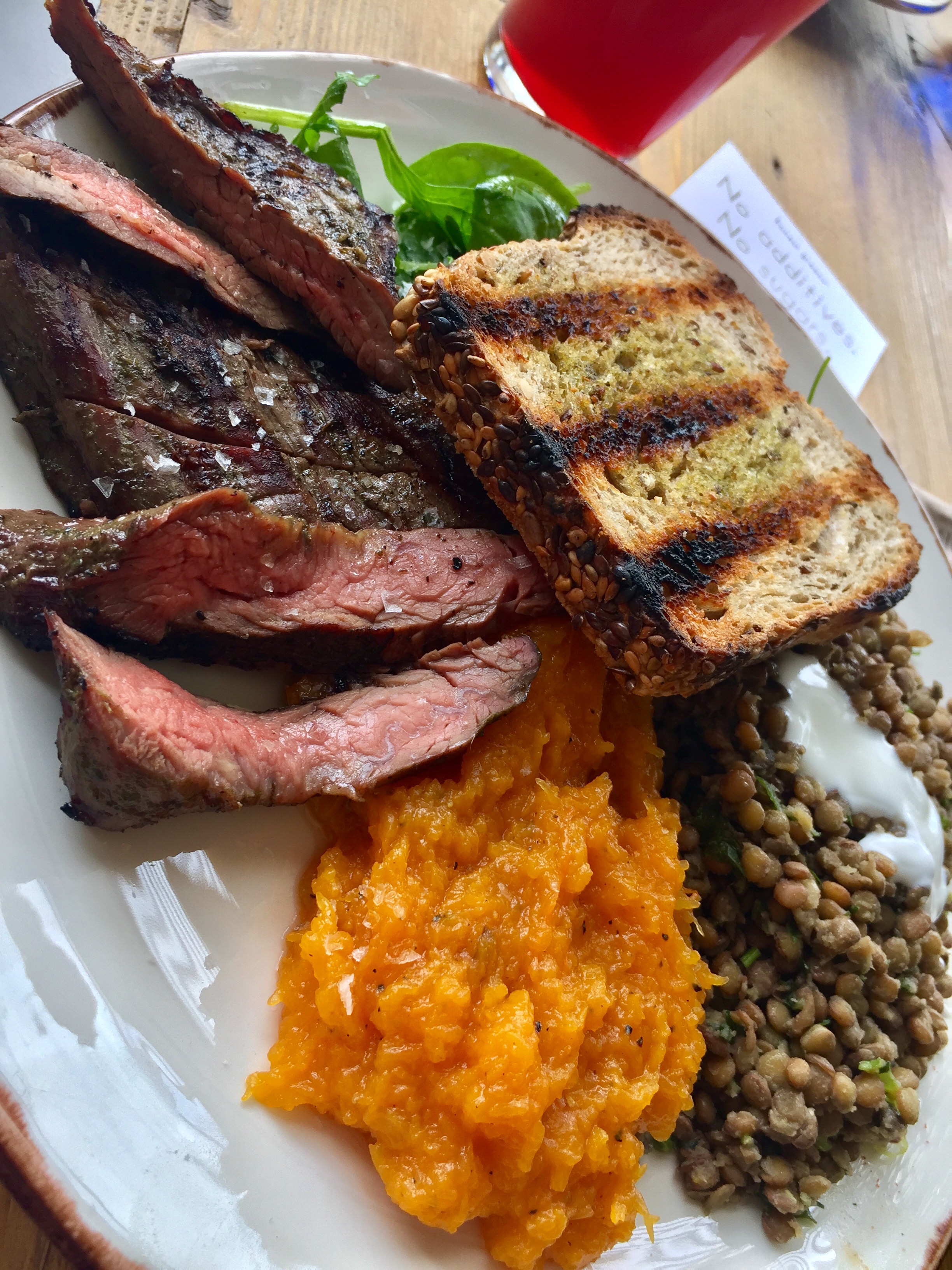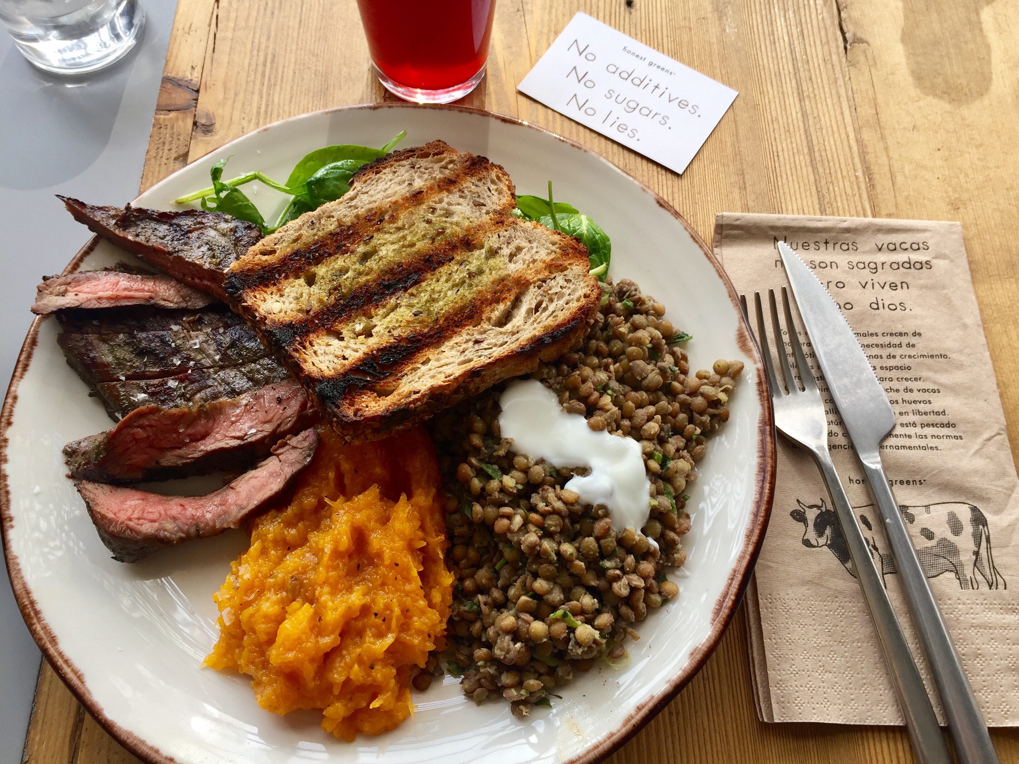 Ternera madrileña de la sierra de Madrid marinada con hierbas (6,90€) + Lentejas pardinas con salsa de yogur y hierbas frescas (2€) + Calabaza asada (2€).