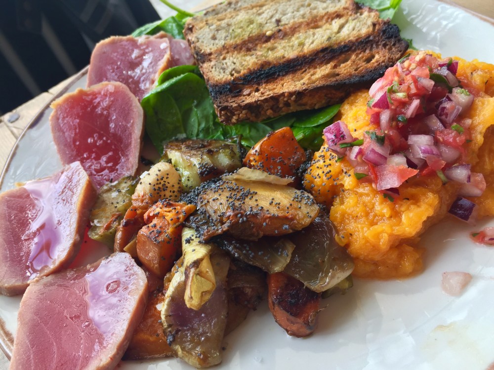Tataki de atún marinado en soja, sésamo y chile (6,9€) + Calabaza asada con pico de gallo (2€) + Verduras de temporada asadas con ben’s coco vegan butter y semillas de amapola (2€).