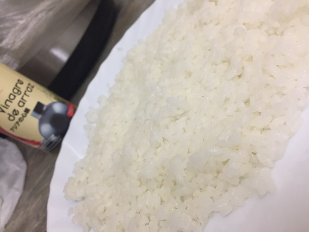 A continuación, añadimos el agua y el arroz, tapamos, ponemos a fuego alto y dejamos hasta que hierva (unos 3 minutos). A continuación, bajamos a fuego medio y dejamos que se acabe de cocinar tapado durante 10 minutos. Pasado este tiempo, retiramos y dejamos tapado durante 5 minutos. Lo extendemos en un plato y aliñamos con la mezcla de vinagre, azúcar y sal. Dejamos enfriar completamente.