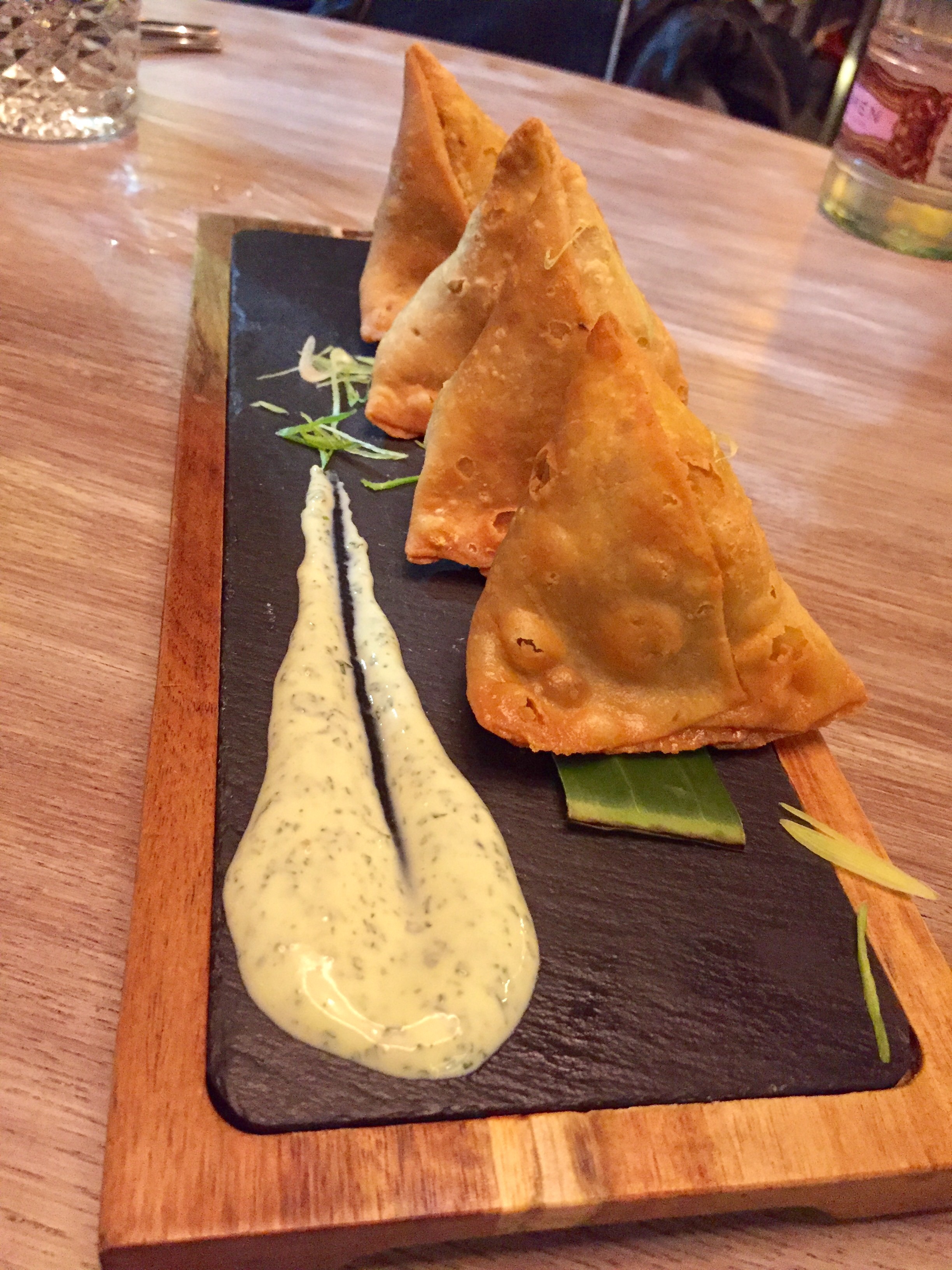 Como dice el título, casi no notas el picante, lo que te permite disfrutar del sabor de cada uno de sus ingredientes. La masa perfecta, en su punto, y el conjunto del plato delicioso. Para repetir. La salsita que véis es de yogur y menta, perfecta para suavizar todavía más las samosas.