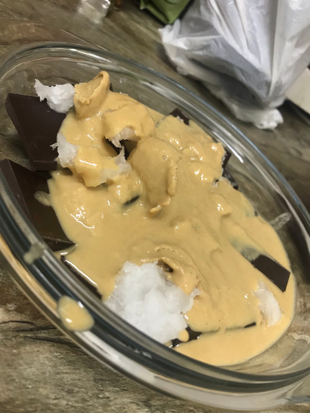 Ponemos en un bol (apto para microondas) el chocolate negro en trozos, el tahini y el aceite de coco y calentamos de 30 en 30 segundos, removiendo de vez en cuando hasta que esté completamente derretido. Mezclamos bien hasta integrar.